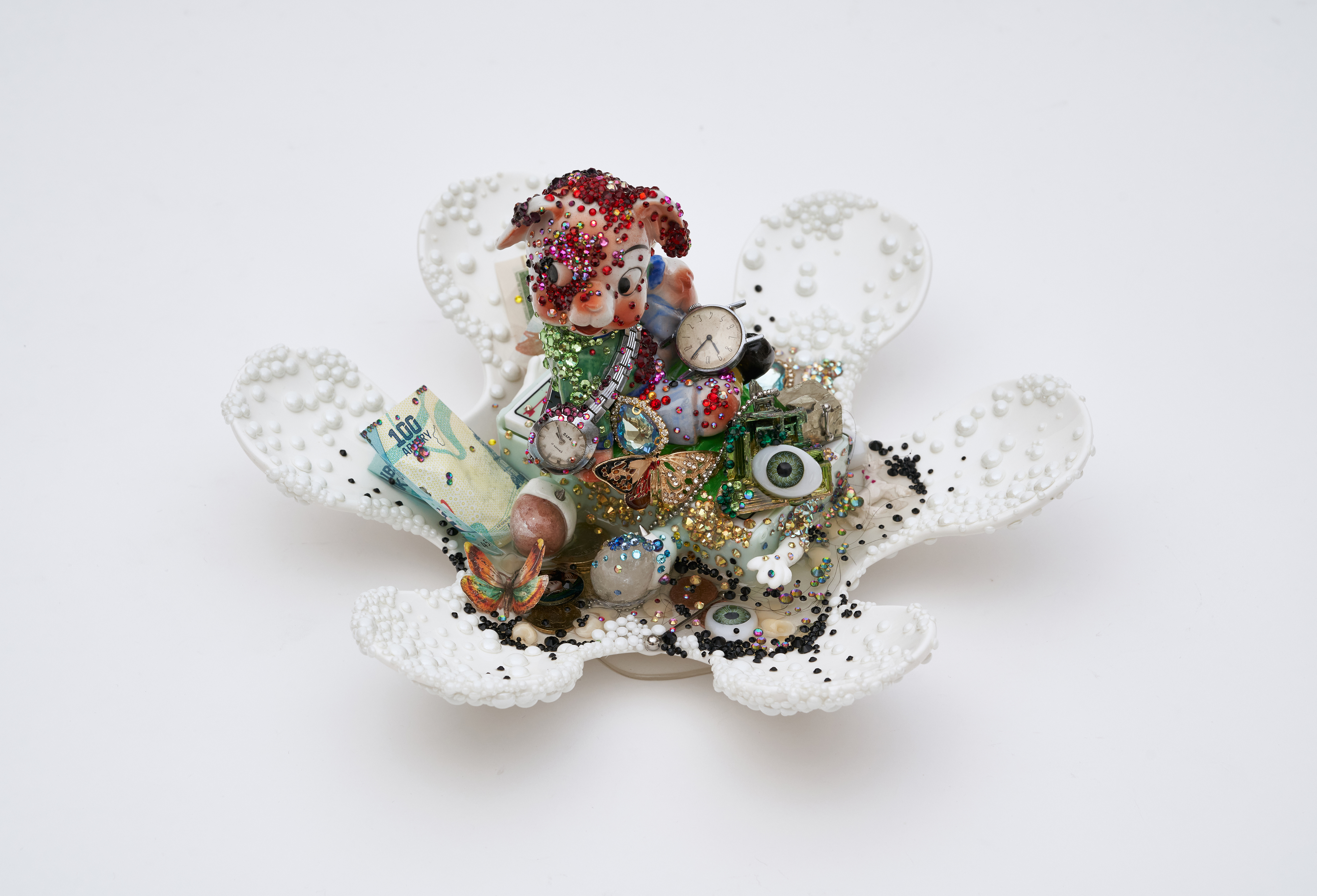 Crystal, coin, doll eyes, paper money, plastic toy, porcelain figurine, resin, resin tooth, rhinestones, antique jewelry/watches, 15x29x25.5 cm.